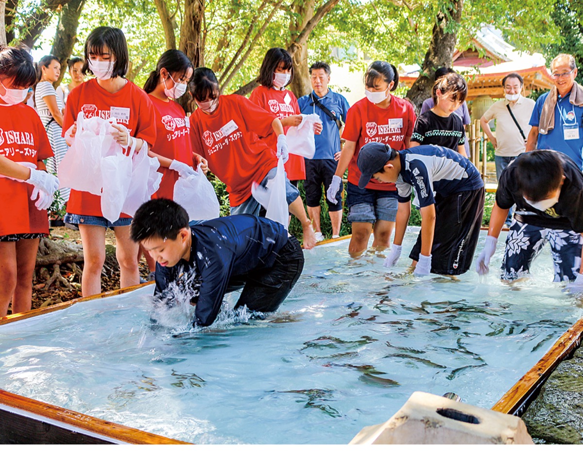 この日はインリーダー(小学5・6年生)12人、ジュニアリーダー14人のほか、青少年指導員や伊勢原ジュニアリーダーズクラブ相談役らが参加。インリーダーは、2m×4m×40cmの生け簀に放流されたニジマスを捕まえようと、濡れながら夢中になっていた。