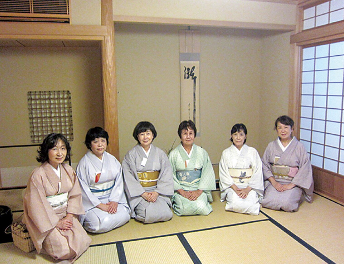 呉服の江戸屋が7月30日、きものでお出かけ会を開催した=写真。裏千家教授の岩田宋美さん(日向)の茶室で夏限定の茶事に参加。夏らしい道具に平茶碗と釣瓶やガラスの水差し、ほおずきとうちわのお香入れで涼やかな茶事を満喫した。