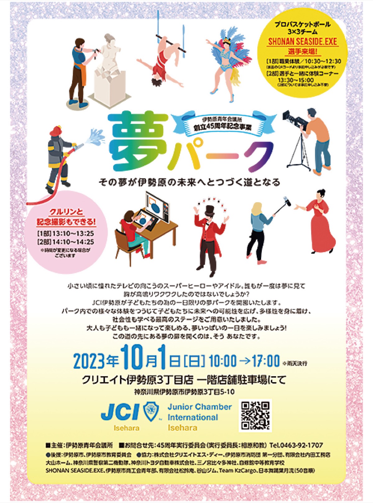 伊勢原青年会議所(佐野嘉一理事長)が創立45周年記念事業「夢パーク」を10月1日(日)、クリエイト伊勢原3丁目店駐車場で開催する。午前10時から午後5時まで。
