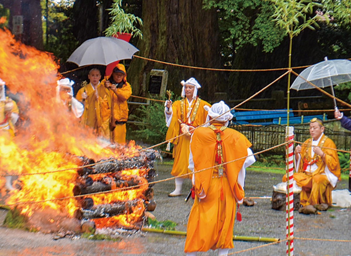 日向薬師宝城坊(内藤京介住職)で10月9日、柴燈護摩供(さいとうごまく)(神木のぼり・火渡り)が特別開催された。