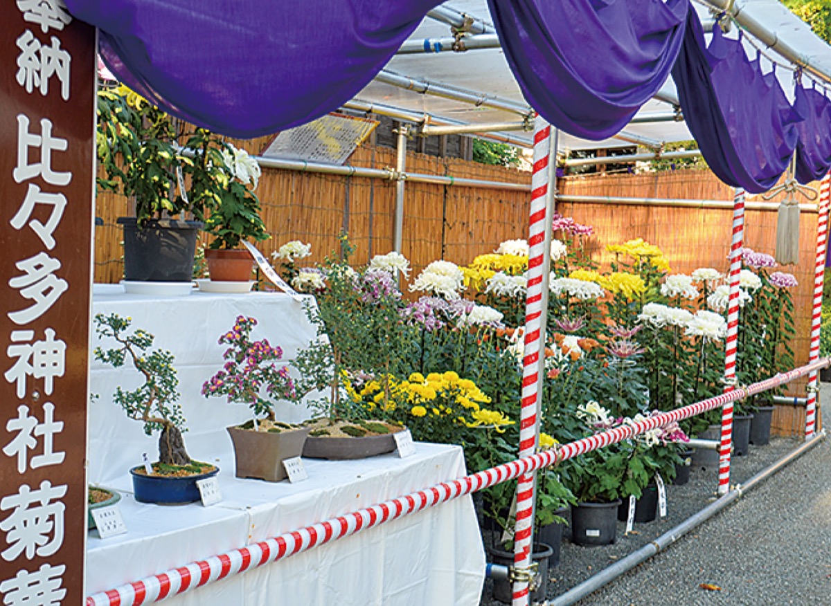 三之宮比々多神社(永井武義宮司)の境内で11月23日(木・祝)まで、比々多神社菊華会(小泉忠孚会長)による菊花展が開催されている。