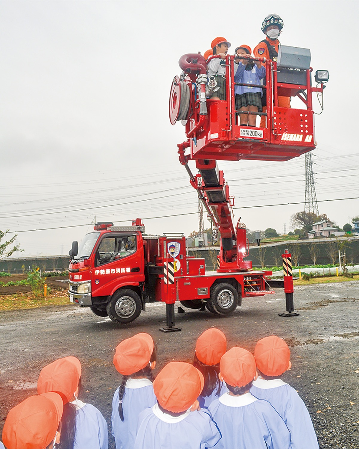 学校法人伊勢原白百合学園・認定こども園伊勢原白百合幼稚園(長塚恵美理事長)で12月12日、防火教育が行われた。当日は伊勢原市消防本部の職員と特別救助隊隊員が同園を訪れ、4階建てのビルなどでも救助が可能な13メートル級はしご車も登場した。