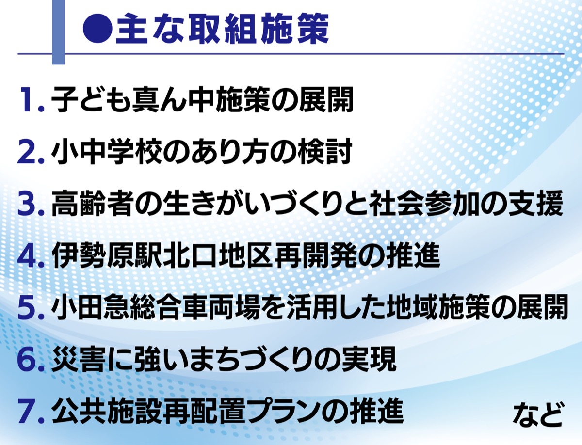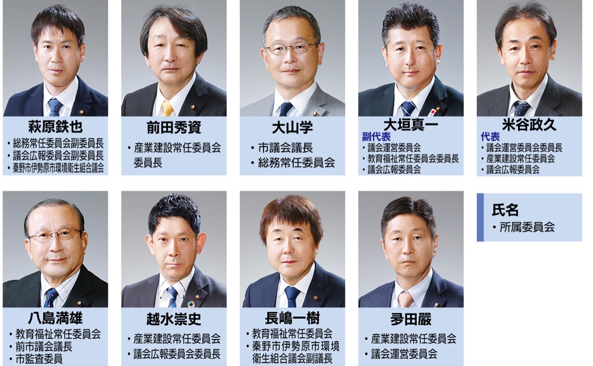 行政からの提案を市民の代表者として議論を重ね市政に反映することだけでなく、ワークショップの開催など、市民の声をしっかり聴き、課題の調査・研究・提言・情報発信を力強く進める市民に近い政策集団として、子どもから高齢者まで誰もが暮らしやすい伊勢原に向けた市民に寄り添った政治を追求してまいります。今後の活動にご期待をいただくとともに、ご支援を賜りますようお願い申し上げます。