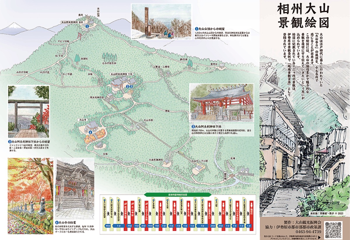 大山地域の観光振興に取り組んでいる団体「大山観光振興会」では、大山の個性豊かで魅力的な景観を紹介するまちあるきイラストマップ「相州大山景観絵図」をこのほど作成した。