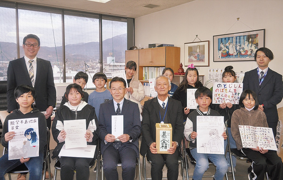 比々多小学校(臼井裕二校長)の6年生と3年生の児童11人が山口賢人教育長を訪れ、能登半島地震の復興支援に役立ててもらおうと約9万円の募金を手渡した。