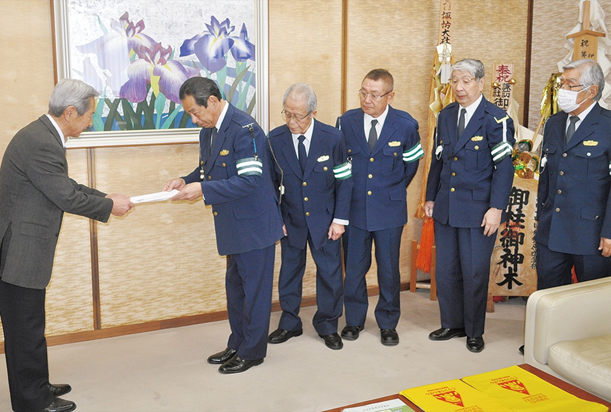 同協会は、新入学の児童を交通事故から守るため、長年にわたりランドセルカバーなどを寄贈している。当日は高山松太郎市長にカバーの見本と目録が飯塚会長から手渡された。