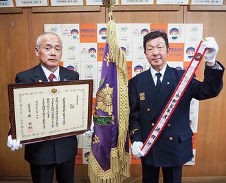 竿頭綬は、防災思想の普及、消防施設の整備、その他の災害の防御に関する対策の実施について、その成績が特に優秀でかつ、表彰旗を授与する消防機関に準ずる消防機関に授与されるもの。市消防本部・消防団は1986年以来、38年ぶりの受賞となった。受賞を受け嶋田消防長、田中消防団長は「市消防本部・消防署と消防団の日頃の活動の賜物であり、今後も職員・団員一丸となり、市民の生命、身体、財産を守っていきたい」と話した。嶋田消防長は消防庁長官表彰(永年勤続功労章)も受章した。