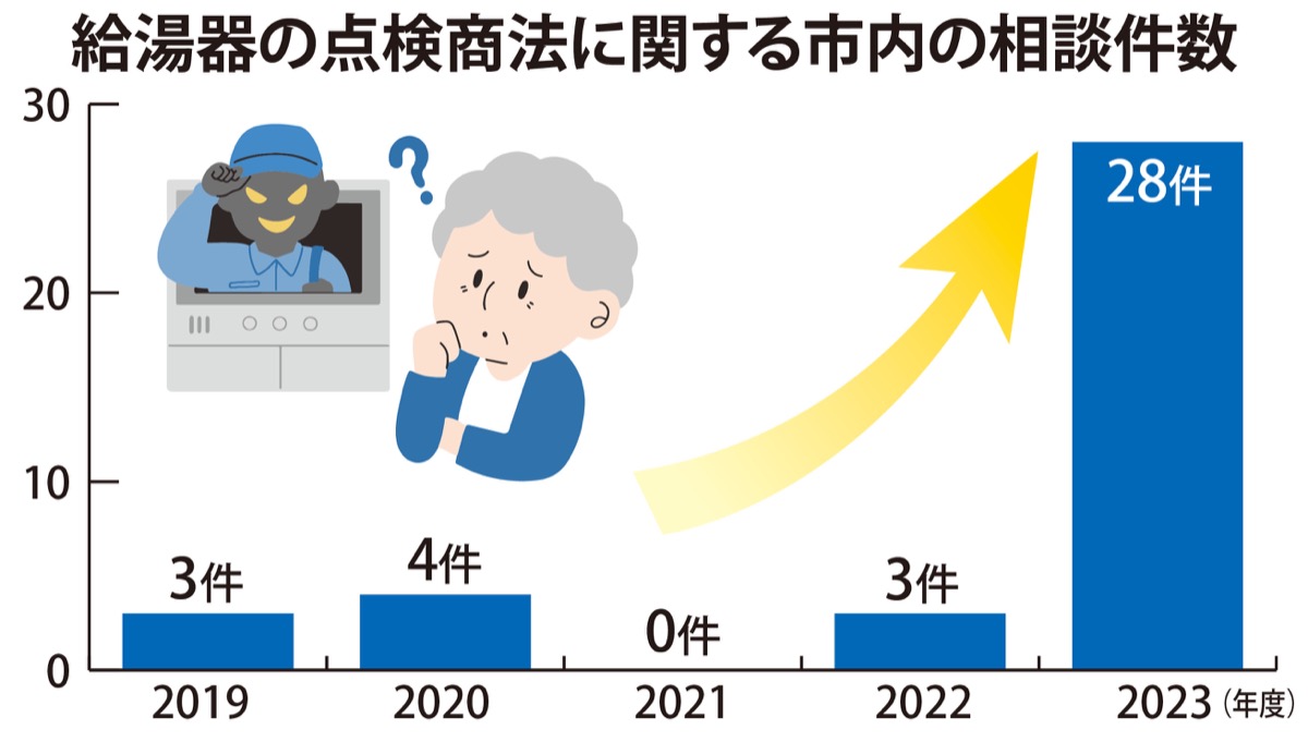 給湯器点検に関する相談は市内、県内のみならず全国的にも増加傾向となっており、市消費生活センターによると「こうした案件に関する電話相談は70代から90代の高齢者が多数を占めている」と話す。
