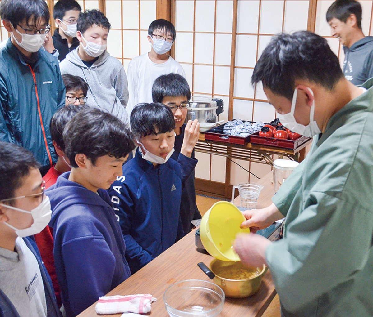 参拝後に下山し、グループごとに宿坊へ。そこで先導師から、大豆から作るとうふ作りを学び、各自が実践。夕食時に自分が作ったとうふを味わった。生徒からは「いつも食べているとうふとは全然ちがう。豆の味がする、家でも作ってみたい」などの感想が上がった。