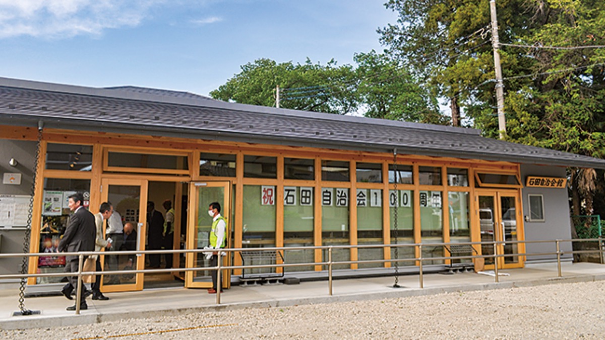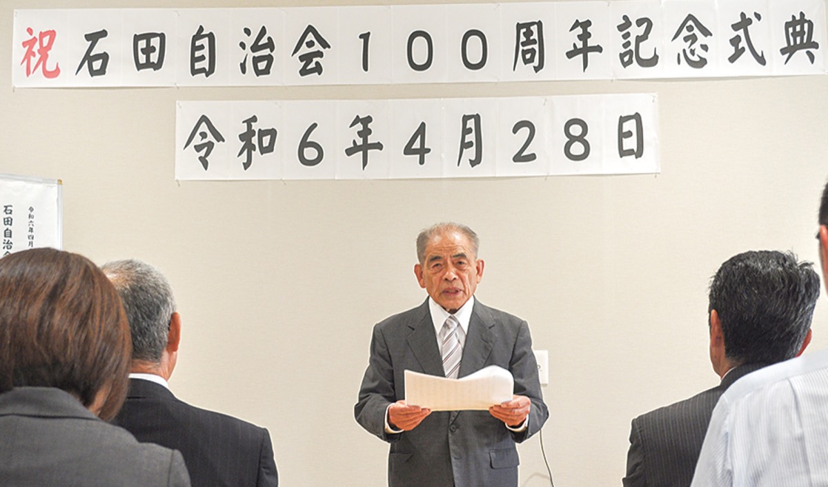 石田自治会(飯原和夫会長)が創設100周年を迎え、新築された自治会館で4月28日、創設100周年記念式典を開催した。この日は同会の歴史を記録した記念誌「100年のあゆみ」も参加者らに配布された。