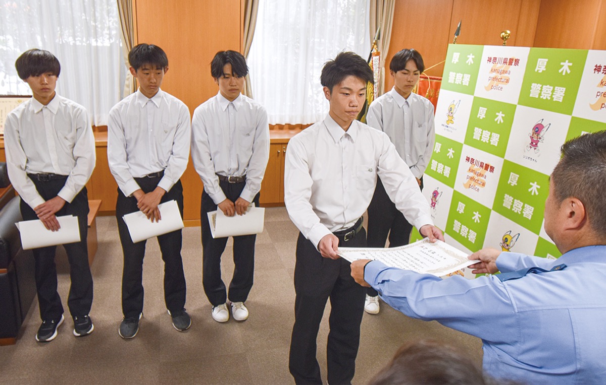 伊志田高校2年生の5人が、自宅から行方不明となっていた80歳代の女性を保護し、5月27日に厚木警察署から感謝状が贈られた。