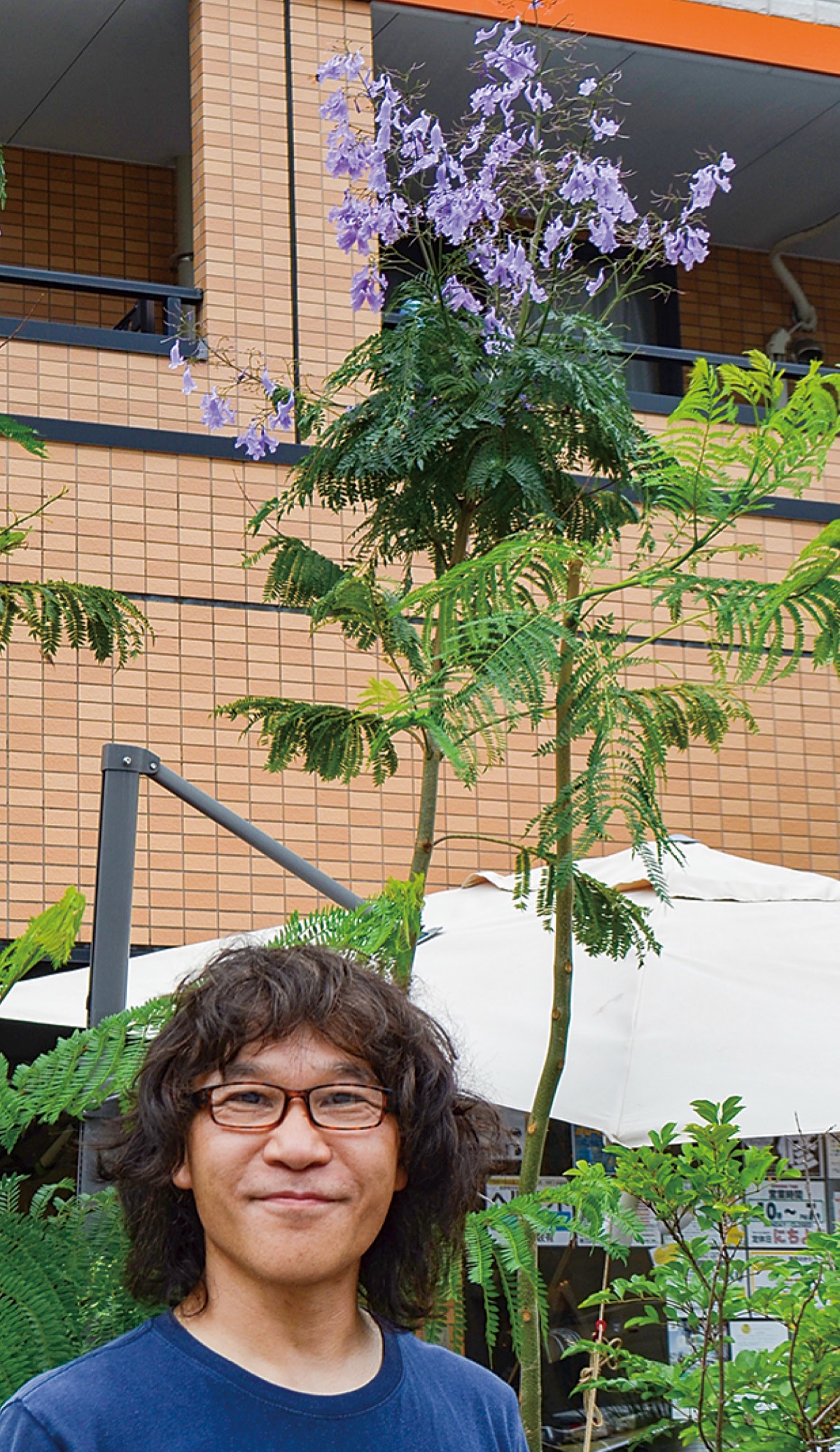 市内伊勢原の自転車店C.H.DONKEYの店頭で「ジャカランダ」の花が咲き、利用客や道行く人たちの目を楽しませている=写真。