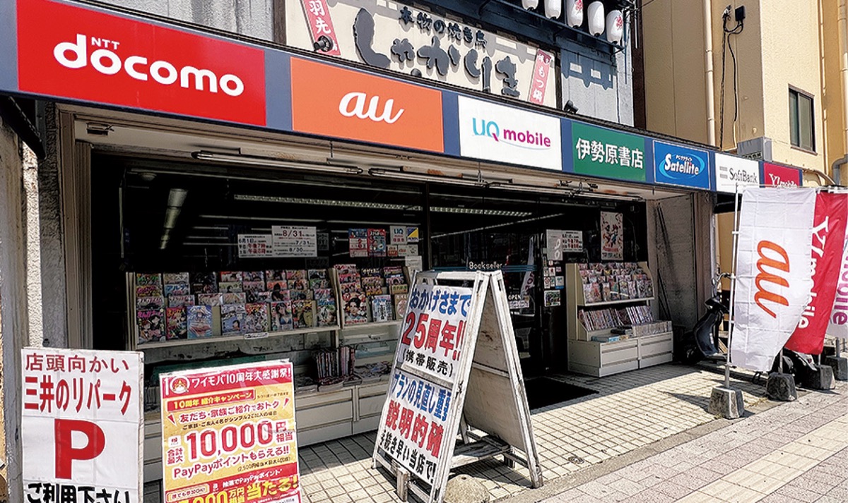 伊勢原書店は1979年10月に創業。30年程前にゲームソフト、25年前から携帯電話の取り扱いを開始し、秦野市や相模原市にも店舗を展開してきた。伊勢原店は創業当初から現在の場所で営業を続けており、伊勢原駅南口からすぐという立地もあり、地元の人々に親しまれている。