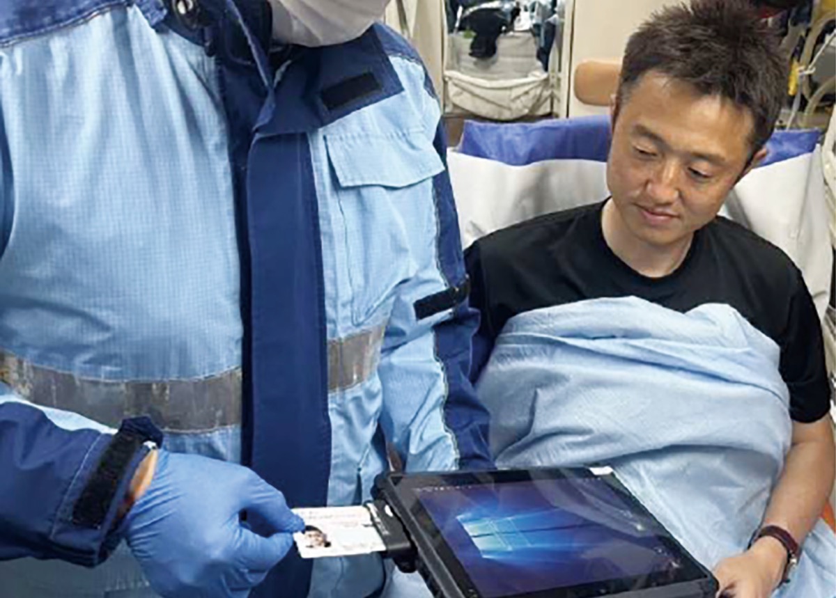 情報の読み取りは、消防庁で配備するカードリーダーを備えたタブレット端末を使用。救急救命士だけでなく救急隊員も「オンライン資格確認等システム」から情報を閲覧する権限が与えられる。