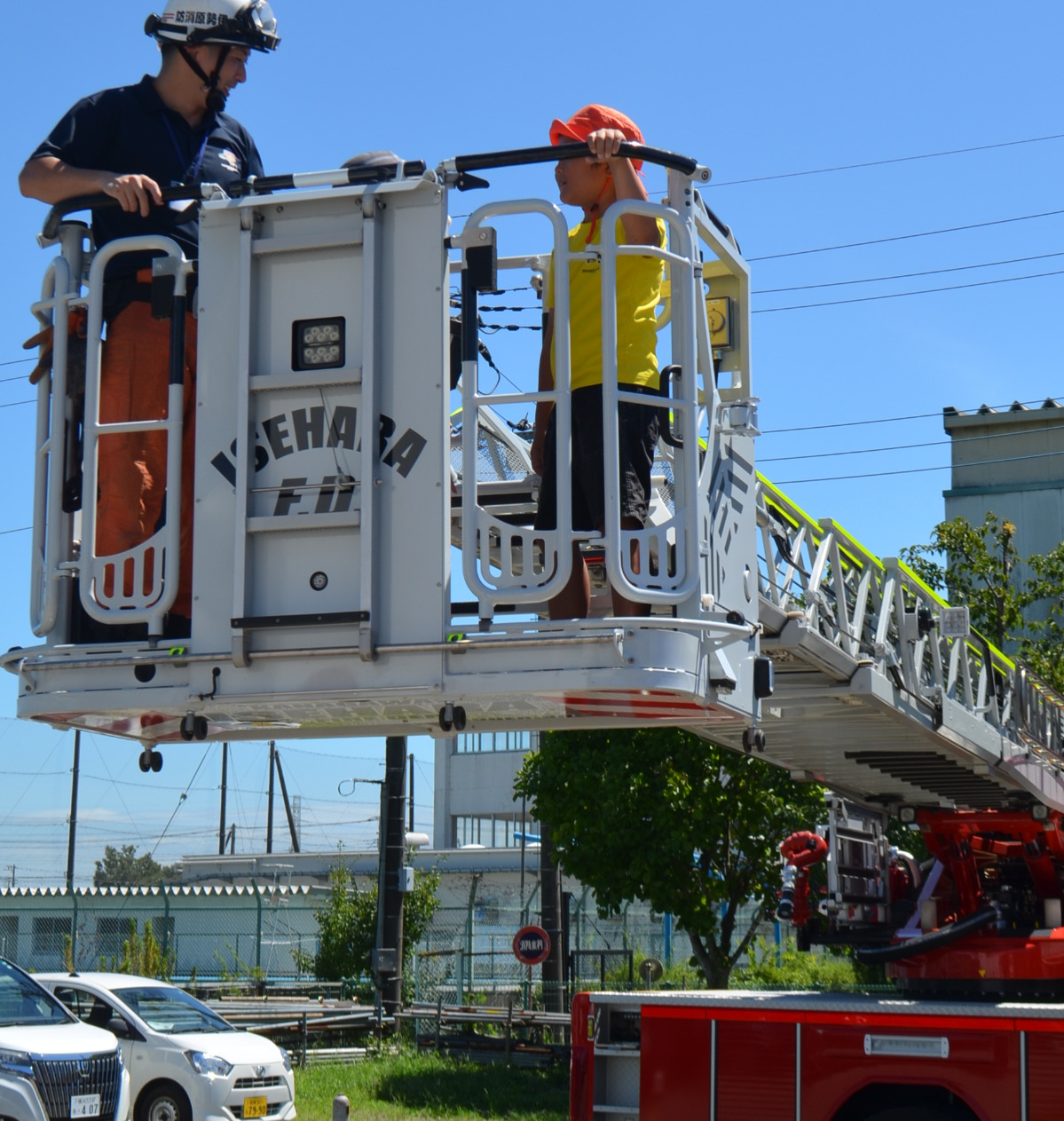 後半にははしご車などの消防車両の乗車体験や放水体験、消防資機材の説明を受けたほか、救急車両も体験。はしご車に乗車した参加者からは「はしご車が30メートルの高さまで行けると聞いてすごいと思った。実際に乗ることができてすごく楽しかった」と笑顔で話していた。