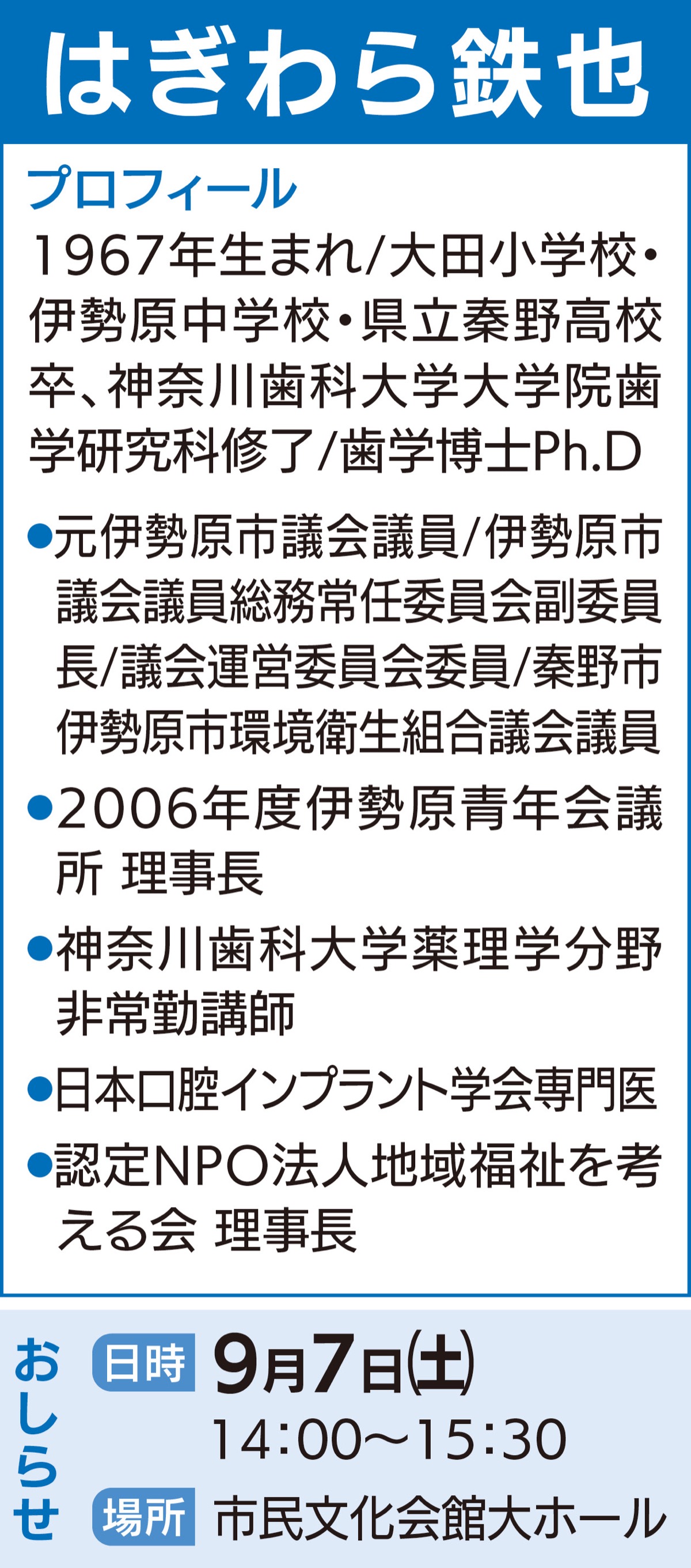 伊勢原市は千載一遇のチャンスを迎えています。新東名高速道路インター周辺、伊勢原駅北口再開発、小田急の総合車両所整備など、市が持ち得るポテンシャルを最大限に引き出し、医療・福祉、子育てや教育の充実など様々な課題解決を図るための最大の力が「伊勢原市民の力」です。