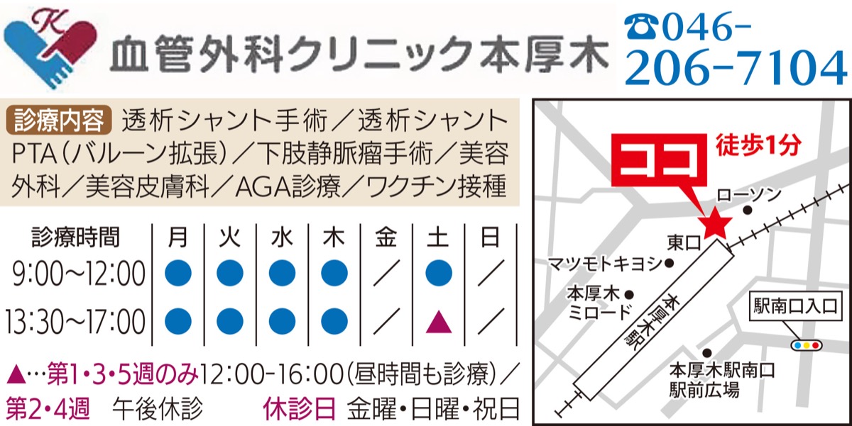 本厚木駅東口から徒歩1分、厚木地区内では初となる血管外科「血管外科クリニック本厚木」が7月に開院した。同クリニックでは下肢静脈瘤と透析シャントの治療を提供している。