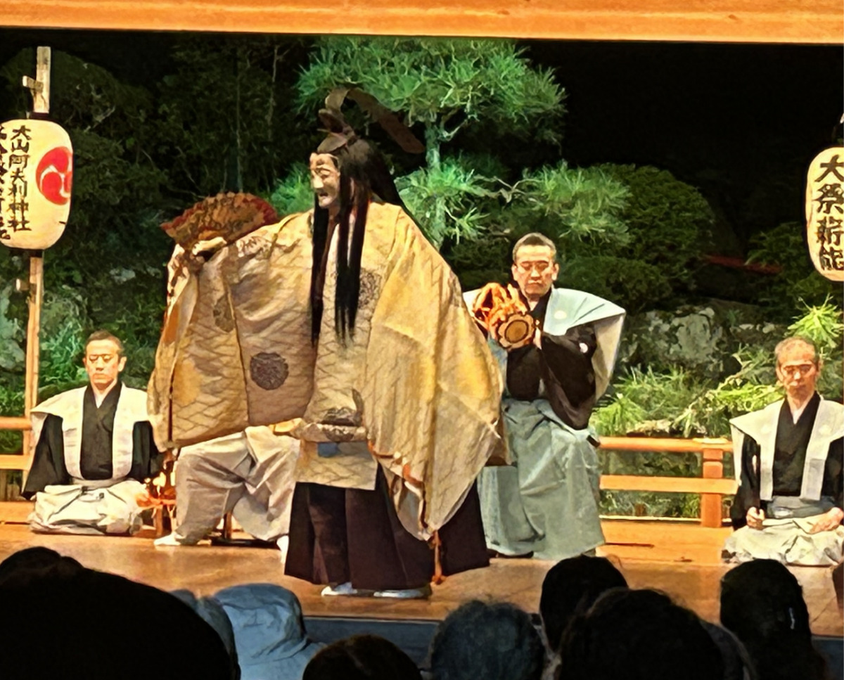 大山阿夫利神社(目黒仁宮司)能楽殿で10月1日と2日、「第43回大山火祭薪能」が開催された。主催は火祭薪能実行委員会、一般社団法人伊勢原市観光協会。かがり火が照らす屋外舞台の能狂言に、観客らは酔いしれていた。
