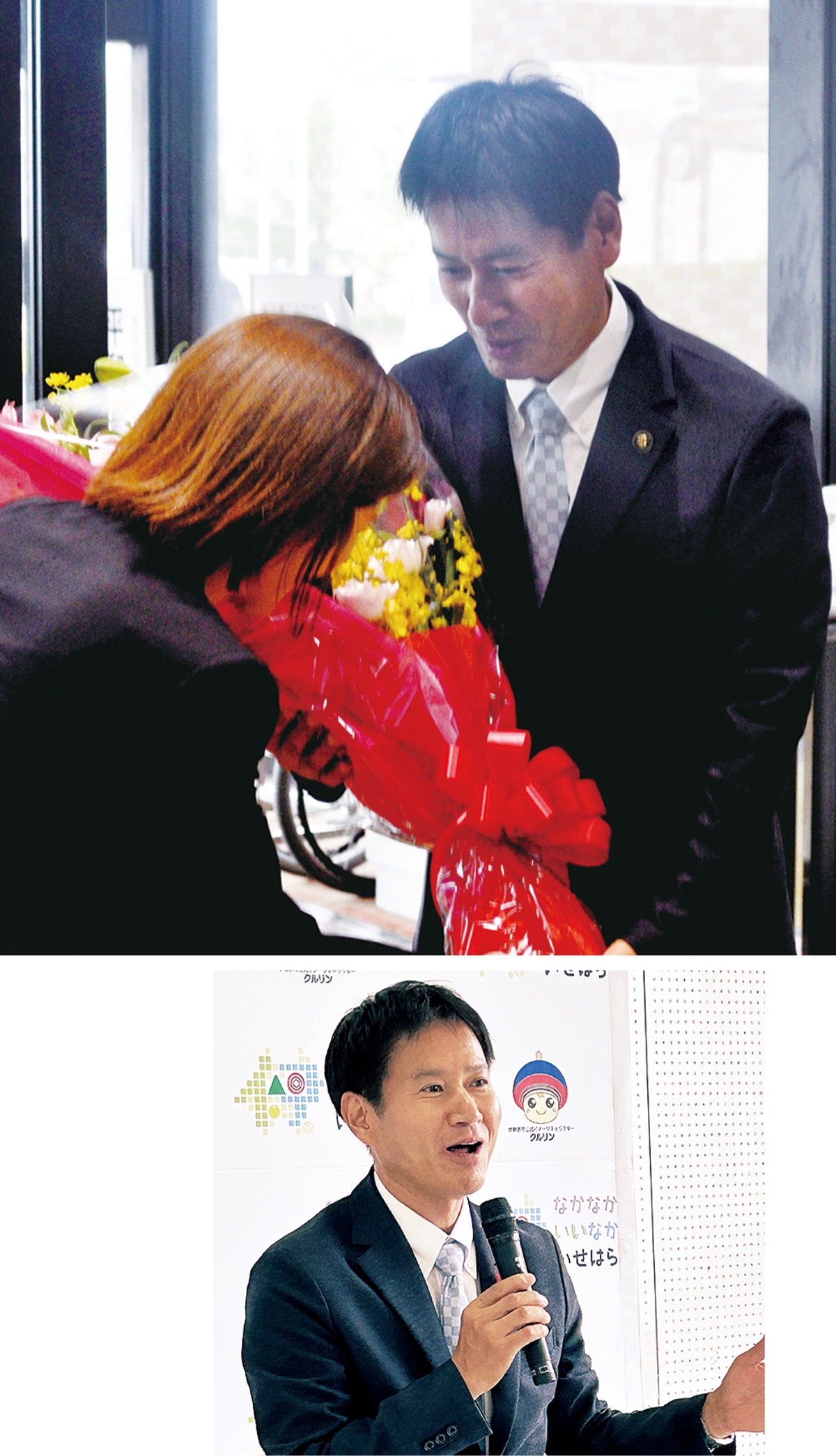 この日初登庁した萩原市長は、市役所1階ロービーで市職員や支援者ら約200人に拍手で出迎えられ、市職員からは花束が手渡された。