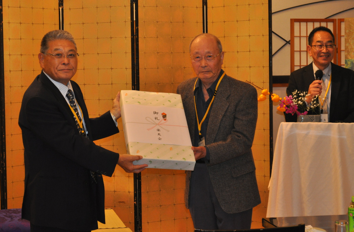 会では金原亭小馬生師匠による落語が披露され会場を笑いの渦に巻き込んだ。また、誕生月の会員への祝いや楽天米の生産に尽力した石田さんに対し、芳賀会長から記念品が贈られた。