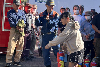 西分署署員による消火器の使用法の説明、的に向かって放水する訓練などを実施。集会所では災害時のタイムラインや自助、共助などに関するDVDの上映や講話、炊き出し訓練として非常食作成の実演なども行った。