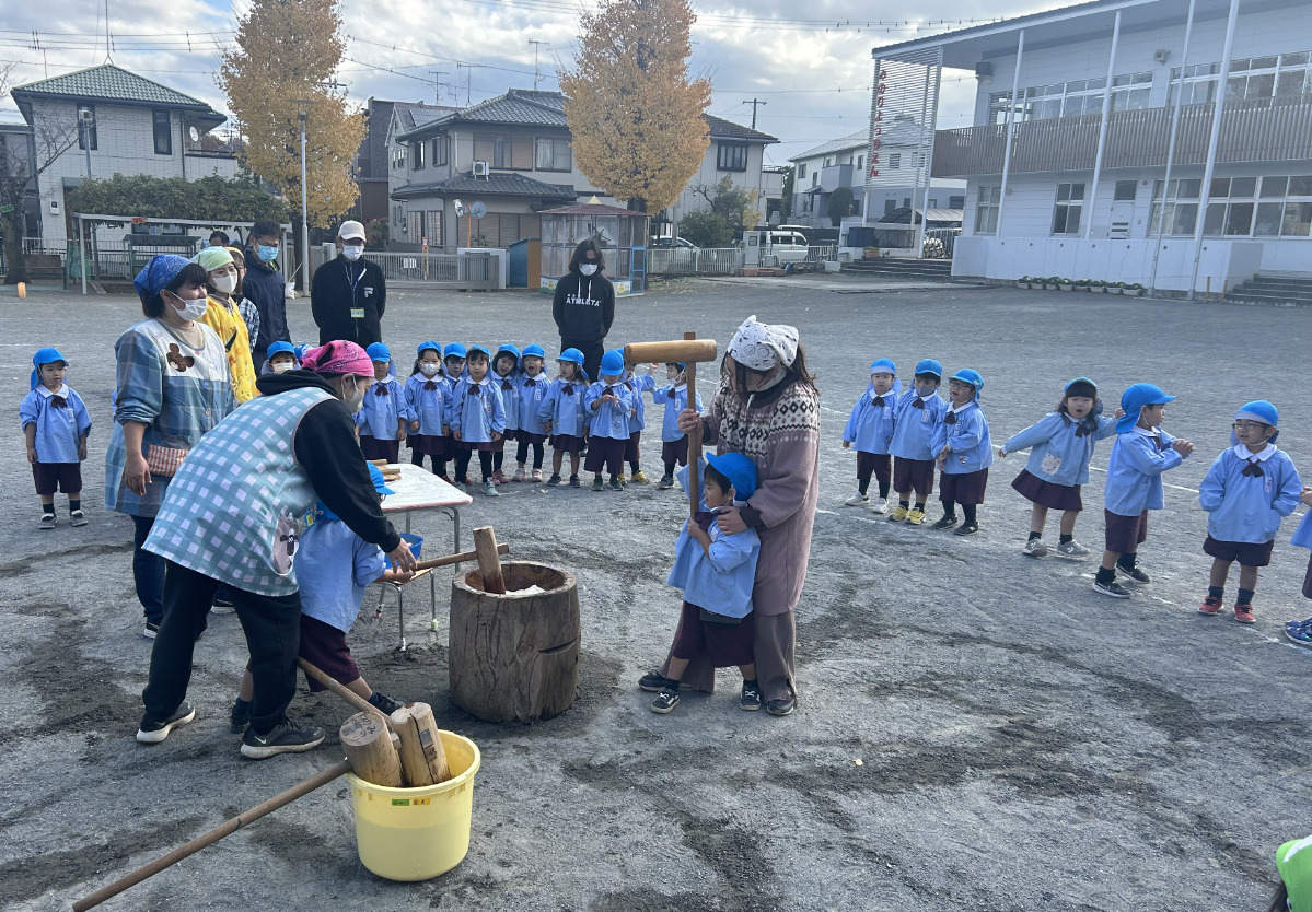 大人たちに続いて、少し小さめの杵を手にした園児たちが、元気な掛け声で教諭といっしょに餅をついて仕上げを行っていった。