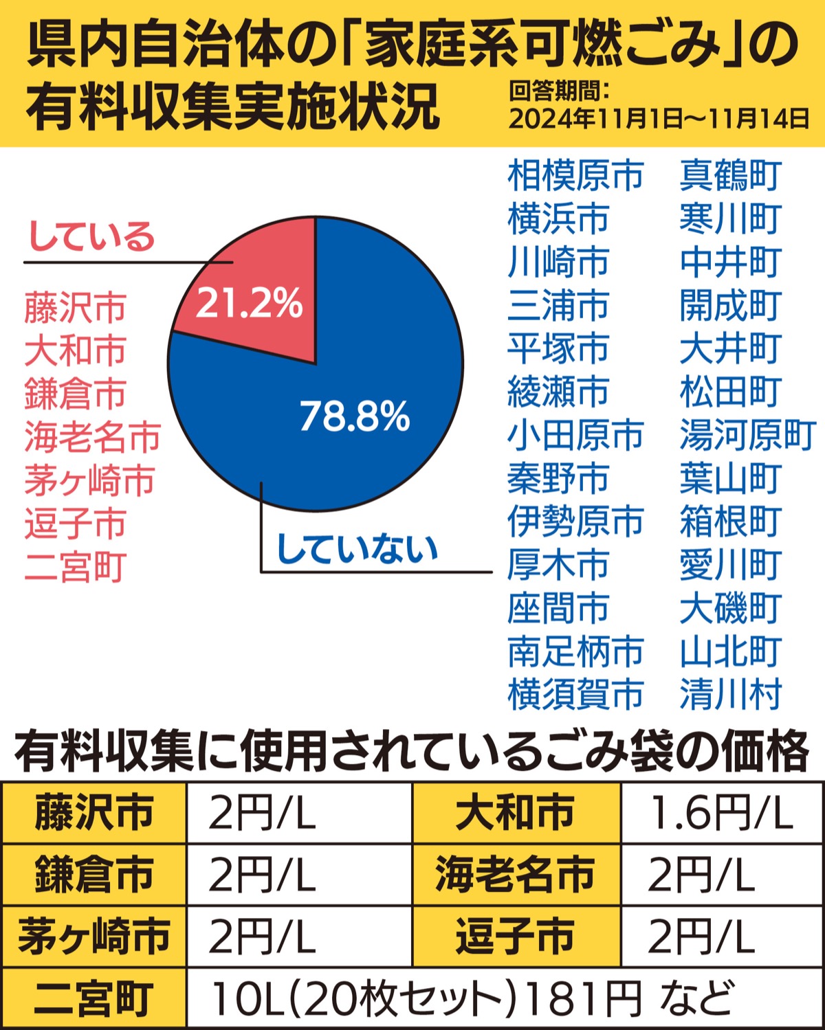家庭系可燃ごみの有料収集(※1)を行う神奈川県内の自治体は2024年11月14日現在、6市1町あり、県内33自治体に占める割合は21%であることが、タウンニュース社のアンケート調査で分かった。国は有料化を推進しており、22年時点で全国の実施率は62%(※2)。