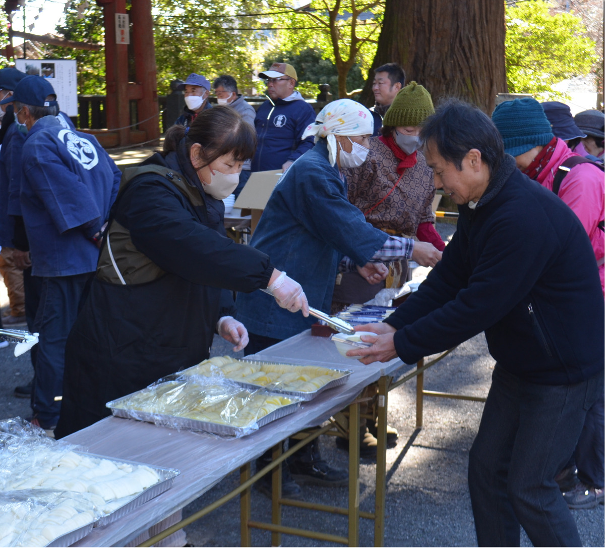 この日は同薬師の世話人や、地元ボランティアなどが調理。付け合わせの沢庵も地元住民が漬けたものが振舞われた。