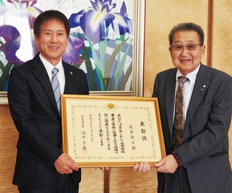 伊勢原市保育協議会会長や県保育会顧問などを務める萩原敬三さん(65)がこのほど社会福祉功労者厚生労働大臣表彰を受賞。1月10日に萩原鉄也市長を表敬訪問し、受賞を報告した。