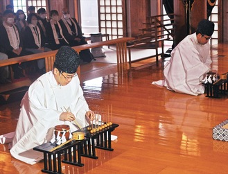 大山阿夫利神社(目黒仁宮司)下社拝殿で1月7日、今年の農作物の出来ばえや天候などを占う「筒粥神事」が行われた。江戸時代後期から300年以上続く同社の伝統的な特殊神事。結果をまとめた筒粥表は、関東一円の農業従事者らに配布される。