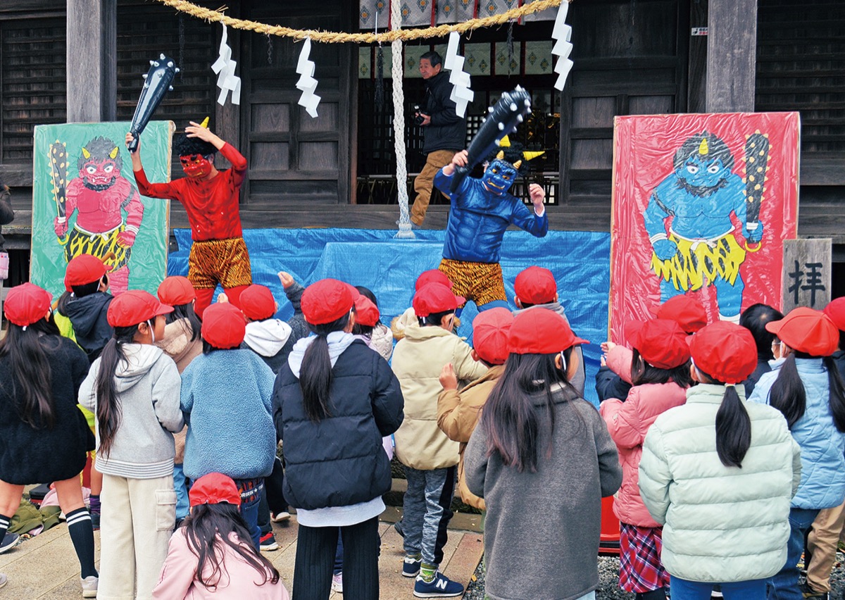 太鼓の音と共に赤鬼、青鬼が登場すると、児童は「鬼は外」と大声で叫びながら鬼に向かって豆を投げた。周りの児童からは「がんばれ」の声援が送られ、神社関係者らは皆笑顔で児童の様子を見守っていた。豆をまき終えると「怖くなかった」「楽しかったと満面の笑顔で楽しんでいた。