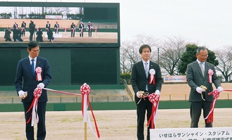いせはらサンシャインスタジアム(伊勢原球場)のスコアボードが、このほど100平方メートルを超える大型ビジョンに生まれ変わった。3月15日には完成披露式典が行われ、萩原鉄也伊勢原市長をはじめ衆議院議員の後藤祐一氏や野球関係者、高山松太郎前伊勢原市長ら来賓が多数出席した。