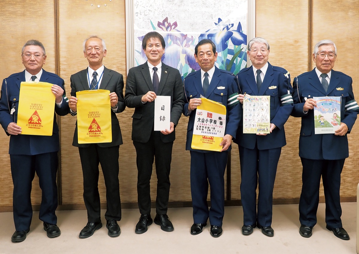 伊勢原交通安全協会(飯塚武彦会長)は3月10日、伊勢原市役所を訪れ、小学校に入学する新1年生に向け、市公式イメージキャラクター・クルリンがデザインされたランドセルカバー810枚と交通安全教材800点を寄贈した。