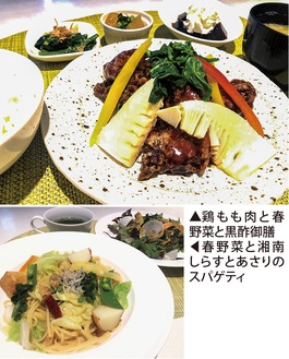 季節限定「春の味覚 鶏もも肉と春野菜の黒酢御膳」(1100円)と、数量限定「春野菜と湘南しらすとあさりのスパゲティ 湘南野菜のサラダ・スープ付き」(1650円)の2品。