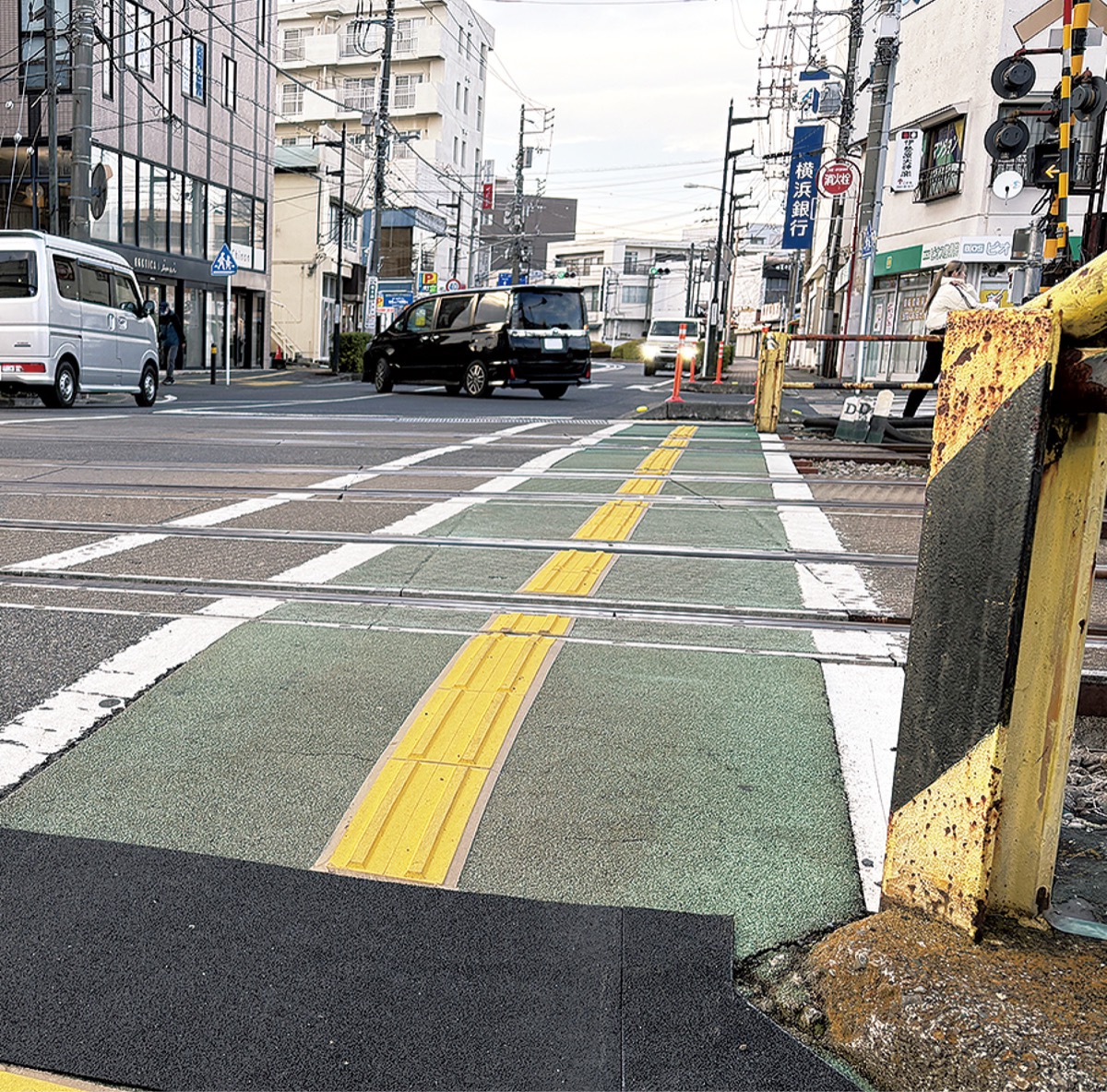 神奈川県では、24年度、25年度の2カ年計画で、県道に接している踏切29カ所にエスコートゾーンを設置する予定で、今回の伊勢原駅横の踏切内への設置もその計画の一環。踏切内に設置されたエスコートゾーンのブロックは黄色で、他の色よりも視認性が高く、特に、薄暗い場所や悪天候時などの状況において有効だという。