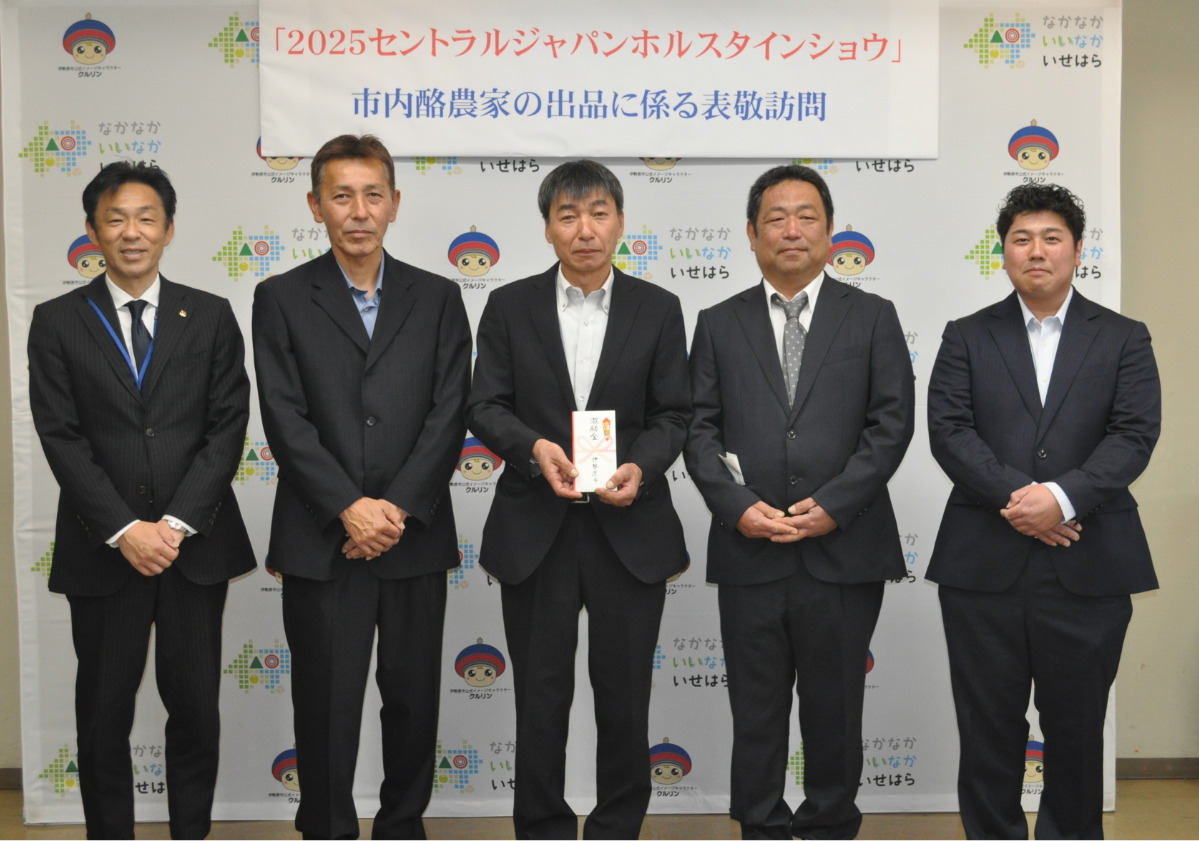 今回のショウでは、神奈川県から18頭が出品される中で、伊勢原市からは4人が6頭を出品する。 出品者の小沼聡氏、三野泰輔氏、柏木利彦氏、熊澤正敏氏は3月27日に市を表敬訪問、大町徹経済環境部長から激励金が贈られた=写真。