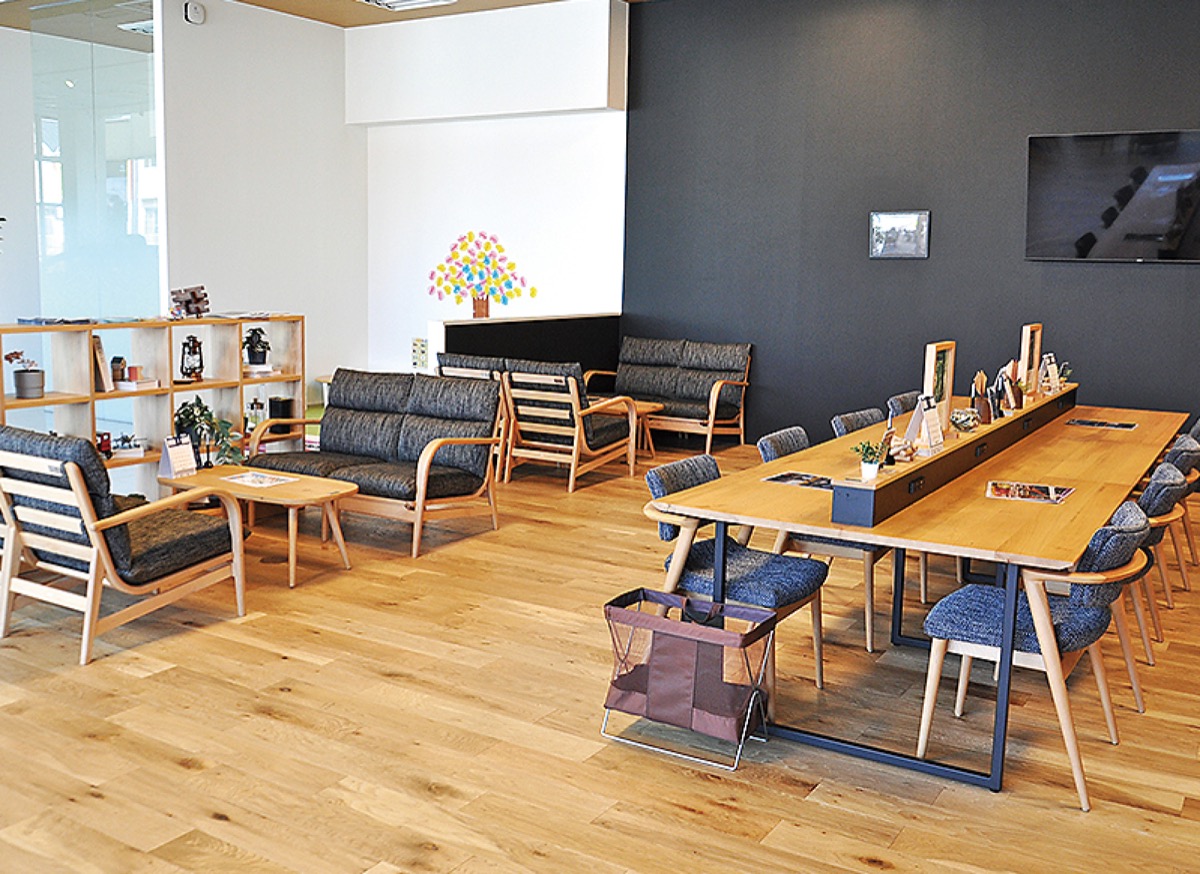 車の点検などの待ち時間を「ゆっくり過ごしてほしい」と同社では10年ほど前からショールームのリニューアルなどに併せてカフェコーナーを設置。これまでは市販の木目調の家具を導入していたが、国産材を有効活用することで自然を守りながら維持し、地球温暖化防止へもつながる取り組みを推進する飛騨産業(株)の想いに共感。同市産のブナ材のテーブルやイスなど約40点を導入した。
