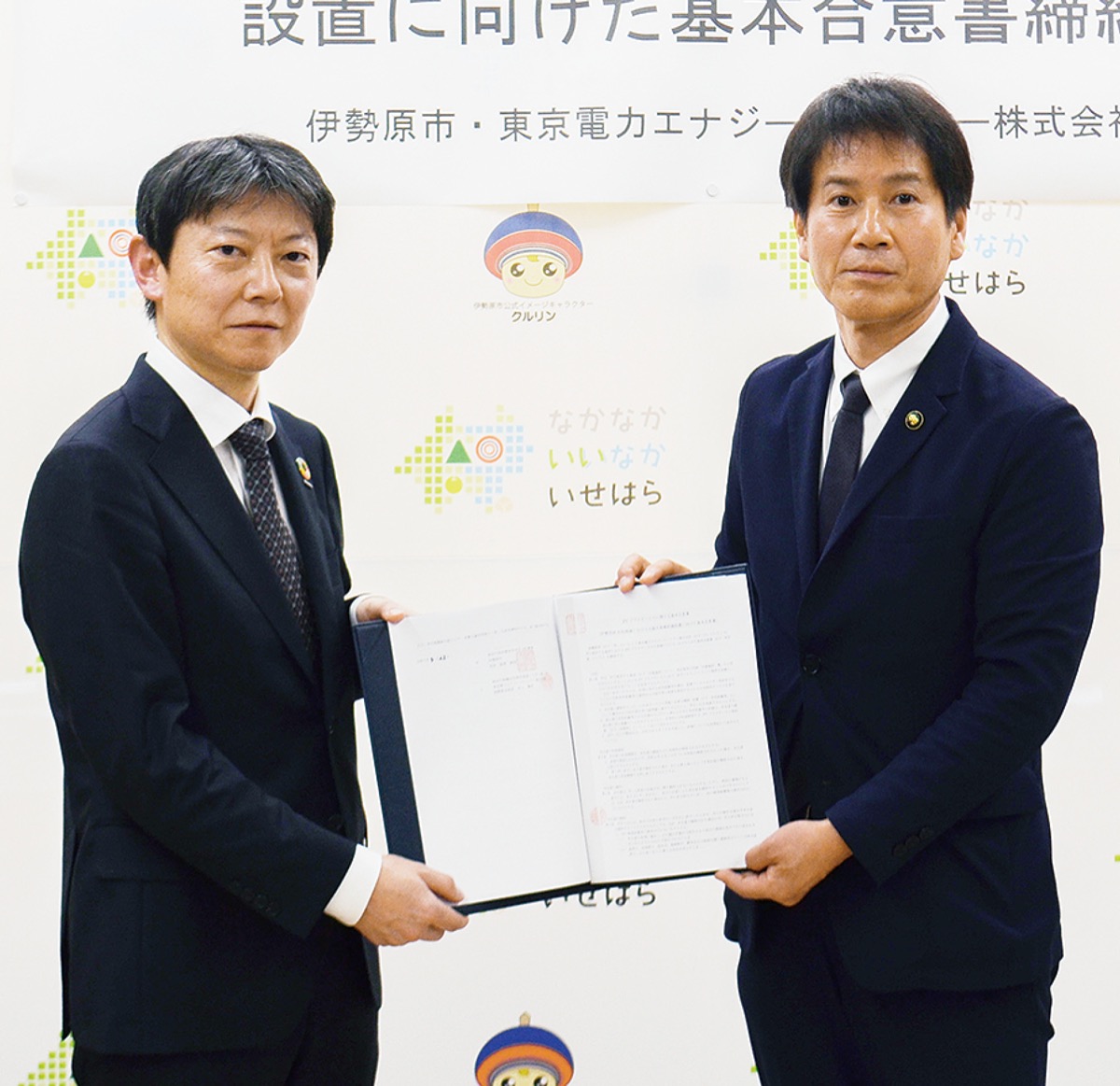 伊勢原市はこのほど、東京電力エナジーパートナー株式会社と「伊勢原終末処理場における太陽光発電設備設置に向けた基本合意書」を締結。4月23日に萩原鉄也市長、同社南関東本部長の井上倫次氏らが出席し、市長公室で締結式が行われた。