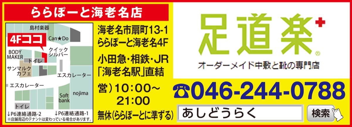 ららぽーと海老名で3年目を迎えた中敷と靴の専門店、足道楽プラス。骨格を矯正し痛みを軽減させる”オーダーメイド中敷”と、ひざ痛を楽にする靴など、遠方から来店する人も多い。股関節症や側弯症、タコ・マメ、魚の目、偏平足、スポーツ障害など、これらの症状は体の土台となる「足首の関節の歪み」に起因していることが多いという。同店の中敷で効果を感じたという声の1位は「膝が痛い」(変形性膝関節症)で、2位以下は外反母趾、腰が痛い(脊柱管狭窄症)、足裏が痛い(足底筋膜炎)、O脚・X脚と続く。