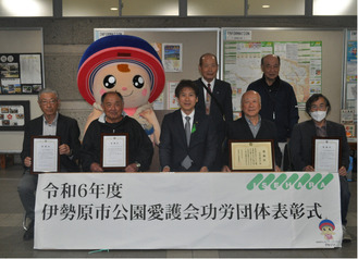 総合運動公園で5月10日、第34回公園緑花まつりの開催に合わせて伊勢原市公園愛護会功労団体表彰式が行われた。地域で継続的に活動を行っている6団体に萩原鉄也伊勢原市長から感謝状が贈られた。