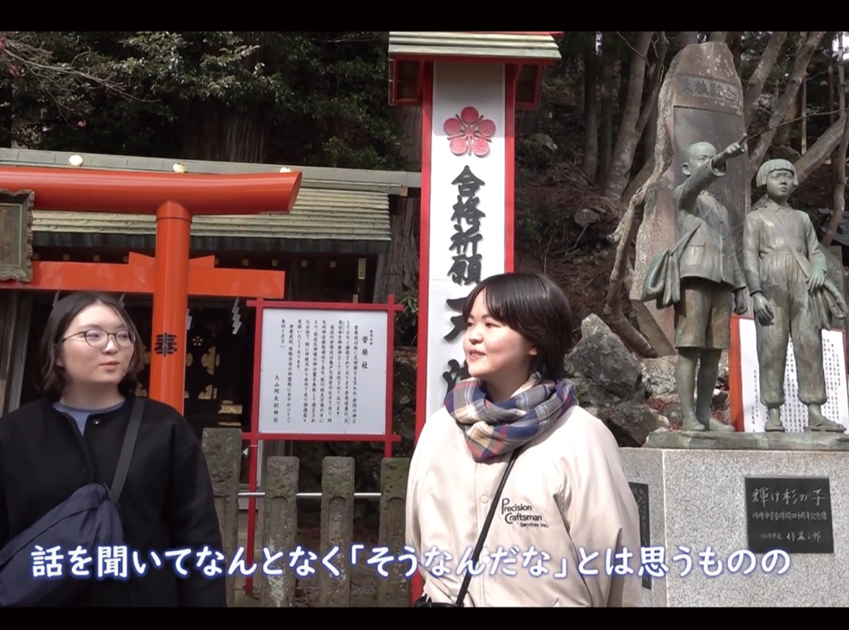 この像は戦時中に大山に疎開した川崎市の学童を記念して大山と川崎市の枡形山に建てられたブロンズ像。学生たちは、建立された経緯やそこに込められた願いについて取材を行った。取材先は、像が置かれた大山阿夫利神社のほか、戦時中に疎開児童が生活していた旅館かすみ荘、枡形山にも及んだ。インタビューでは、川崎市退職教職員の会の米田信一氏と、大山先導師会旅館組合長の内海博文氏が証言を寄せている。