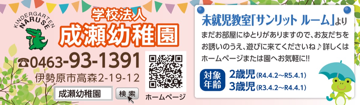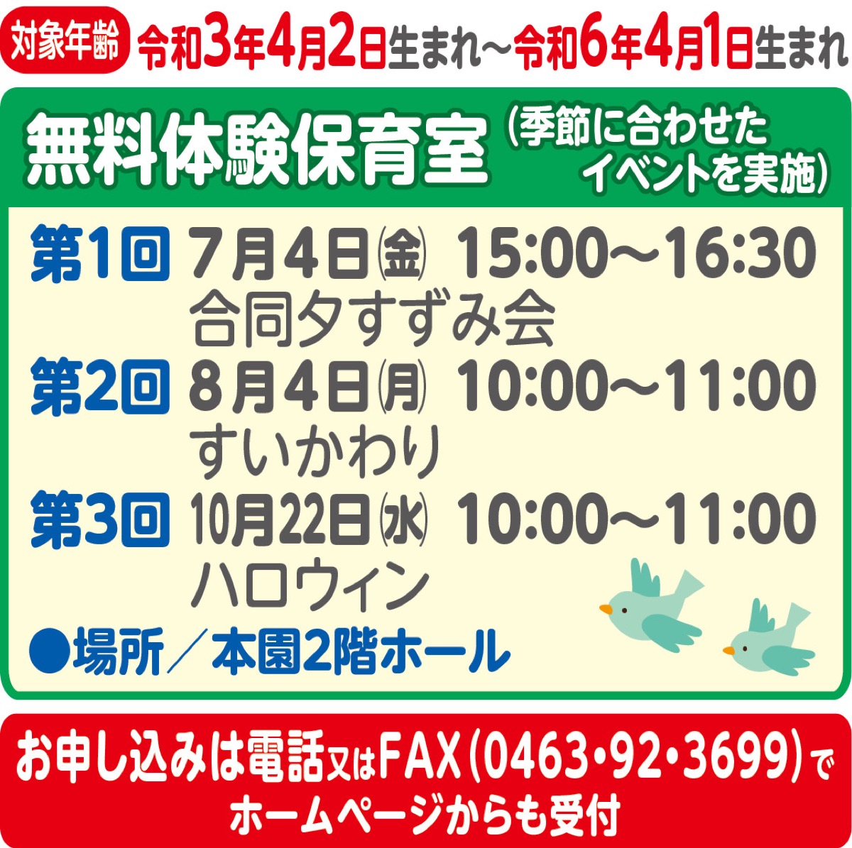 夕すずみ会、すいかわり、ハロウィンなど、季節のイベントを体験できる成瀬幼稚園の『無料体験保育室』に参加してみませんか。幼稚園の先生たちと一緒に体操遊びやリズム遊び、製作や読み聞かせなどを体験していただけます。お子さまの集団生活の学び場、そして保護者の皆さまの情報交換の場としてぜひご活用ください。たくさんのご来園をお待ちしております。