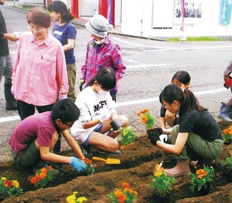 同振興会では、まちなかに彩りを添えようと春と秋に花いっぱい運動の一環として植栽を実施している。振興会の会員8人と比々多小学校PTA白根の保護者9人、児童10人が参加。児童は会員たちに指導を受けながらポーチュラカ、ベコニア、マリーゴールドなど355株を植栽した。