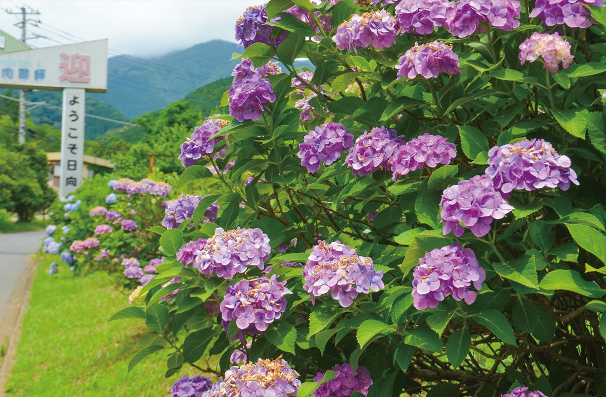 日向地区にある古道「日陰道」や、周辺地区一帯で、色鮮やかなアジサイが、散策路や街道沿いで多くの人の目を楽しませている。