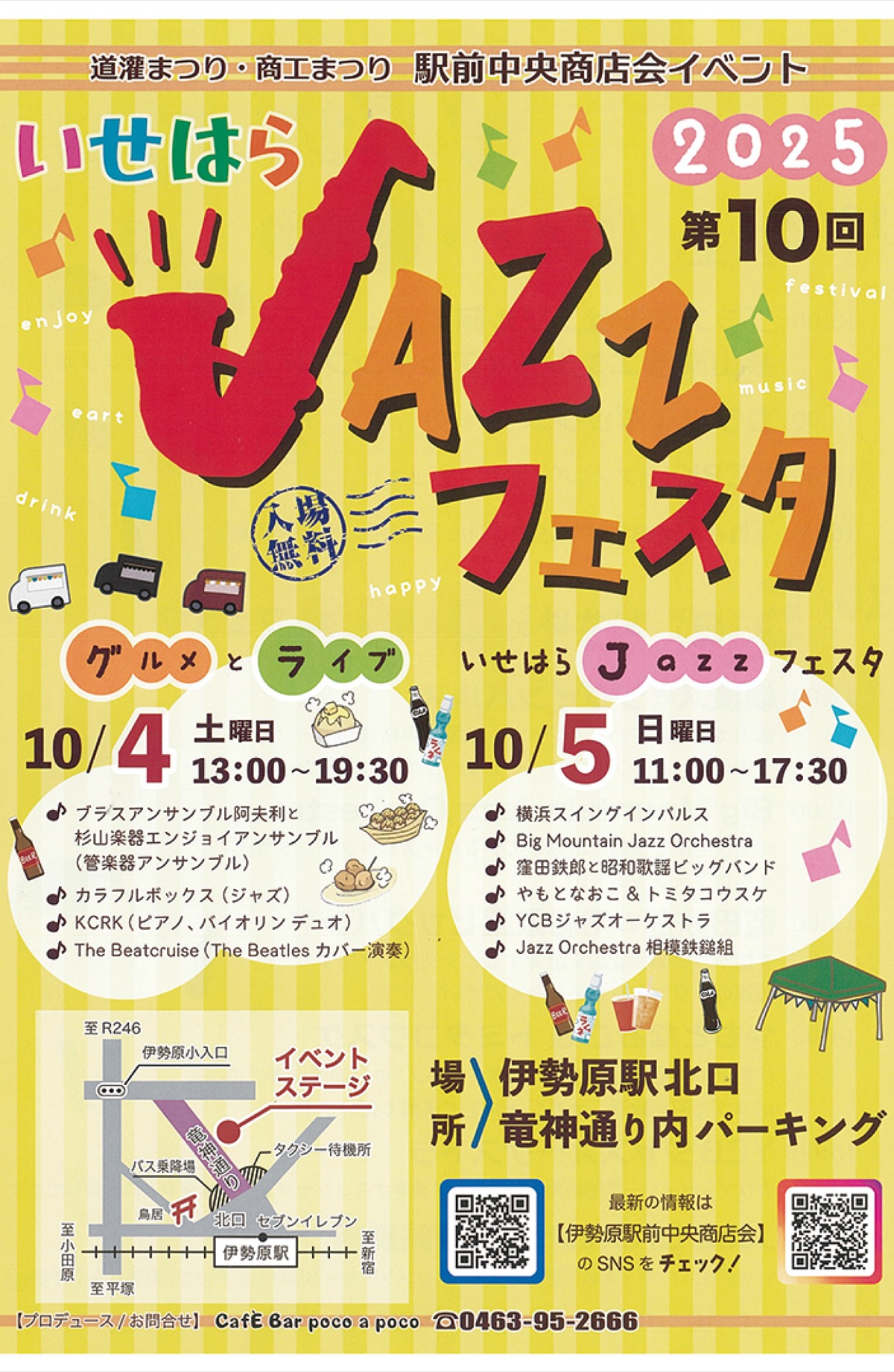 駅前中央商店会による「第10回いせはらJAZZフェスタ」が10月4日(土)午後1時〜7時30分と5日(日)午前11時〜午後5時30分、伊勢原駅北口の竜神通り内パーキングを会場に開催する。入場は無料。