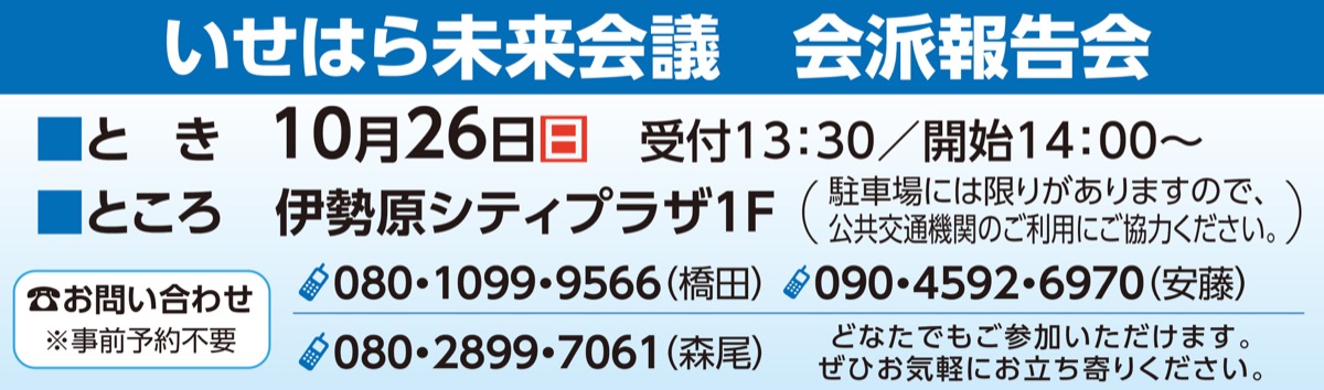 すっかり秋めいてまいりましたが、皆さまいかがお過ごしでしょうか。日頃より、いせはら未来会議の活動にご理解とご協力を賜り、心より御礼申し上げます。このたび、会派報告会を開催いたします。定例会での審議内容や一般質問・政策提案、市政の現状と課題、日頃の地域活動について、3名からご報告します。会の後半は意見交換の時間を設け、皆さまからの質問やご意見を直接お受けします。
