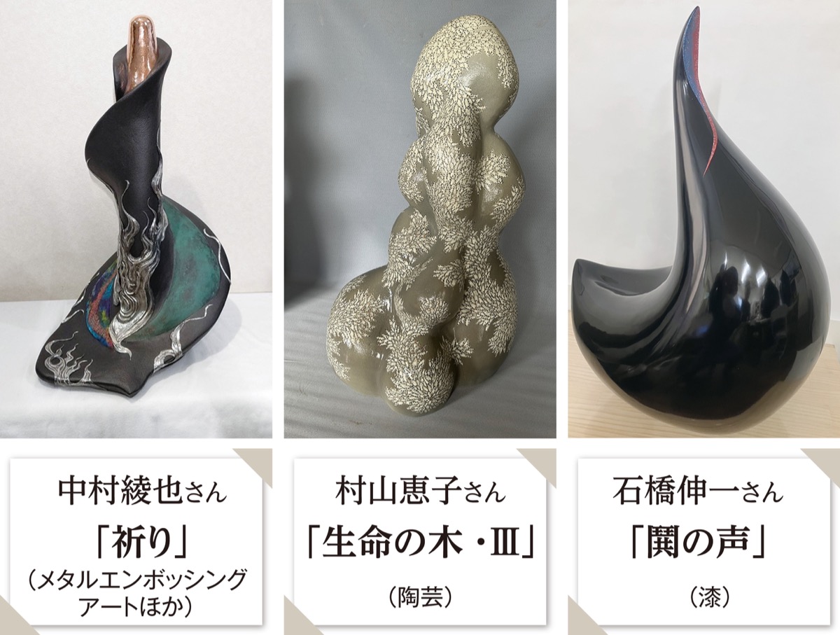 同じく石田在住の中村綾也さんの入選作は「祈り」。金属の部類に属し、メタルエンボッシングアートや七宝焼き、鍛金といった複数の技法を組み合わせた意欲作だ。世の中のさまざまな出来事に対し、作品を見る人の気持ちがリラックスし、平和への気持ちを抱けるようにとの願いが込められている。