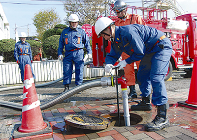 消防署員の指導の元、参加した団員は作業を丁寧に確認し、土のうは砂を過多に入れると重すぎて運びにくいことや、放水時の操作法、消火活動中の段取りなどを確認していた。