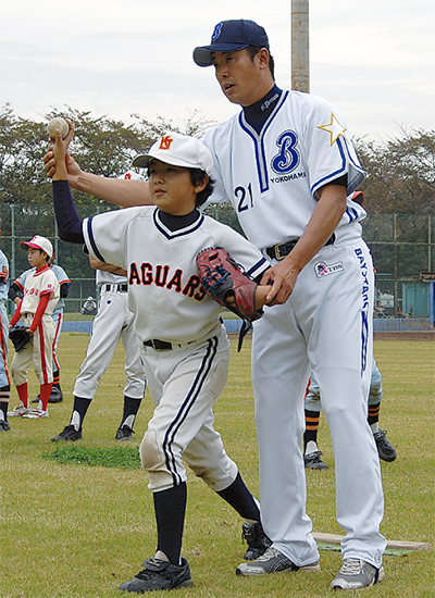 元横浜ベイスターズの野村弘樹氏=写真右=と鈴木尚典氏による野球教室が11月3日に光綾公園野球場で開かれ、市内の小学生約170人が参加した。
