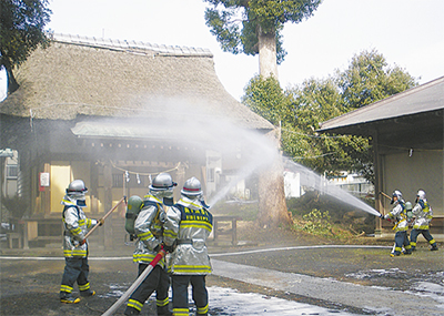 訓練では本殿と拝殿が放火されたと想定し、通報から放水までを行った。実際に119番通報し、司令室から連絡を受けた消防職員が放水を実施。迅速に消火活動を行った。同日には、市内全6カ所の指定文化財管理場所でも消防用設備点検が行われた。